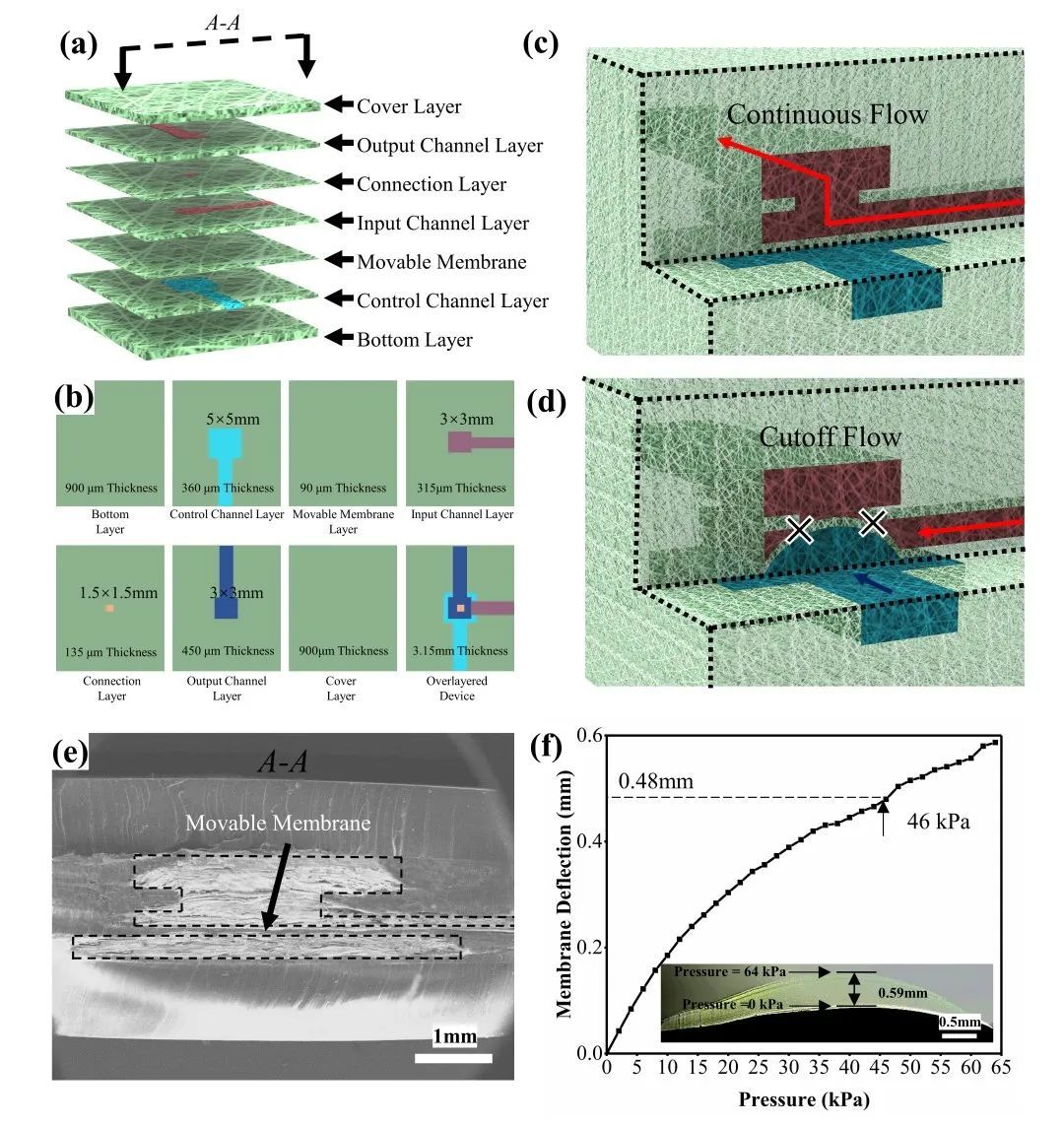 图5: 微流体增益阀的结构特性。(a)示意图;(b)设计结构尺寸;(c-d)工作原理;(e)打印的阀芯截面;(f)可动膜在通道中压力作用下的挠曲特性。